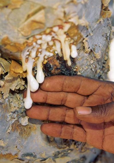 Também se aproveitam as resinas que caem no solo, mas estas são consideradas de qualidade inferior.